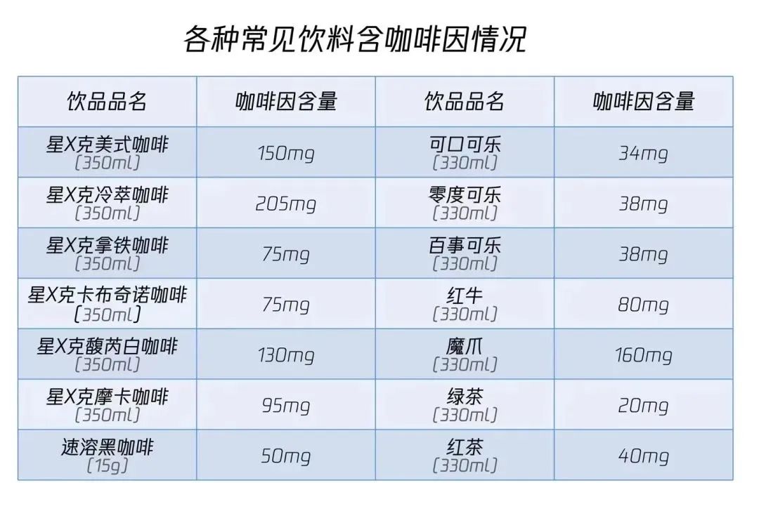 (图:数值仅供参考,实际咖啡因含量会根据品牌、批次、冲泡时间等因素的不同而存在一定差异。)除了咖啡本身,还有很多饮料也含有咖啡因,比如可乐,功能性饮料(H牛、M爪、D鹏特饮)等、茶(包括奶茶),如果当天喝了这些饮料,记得少喝点咖啡,以免咖啡因超标。