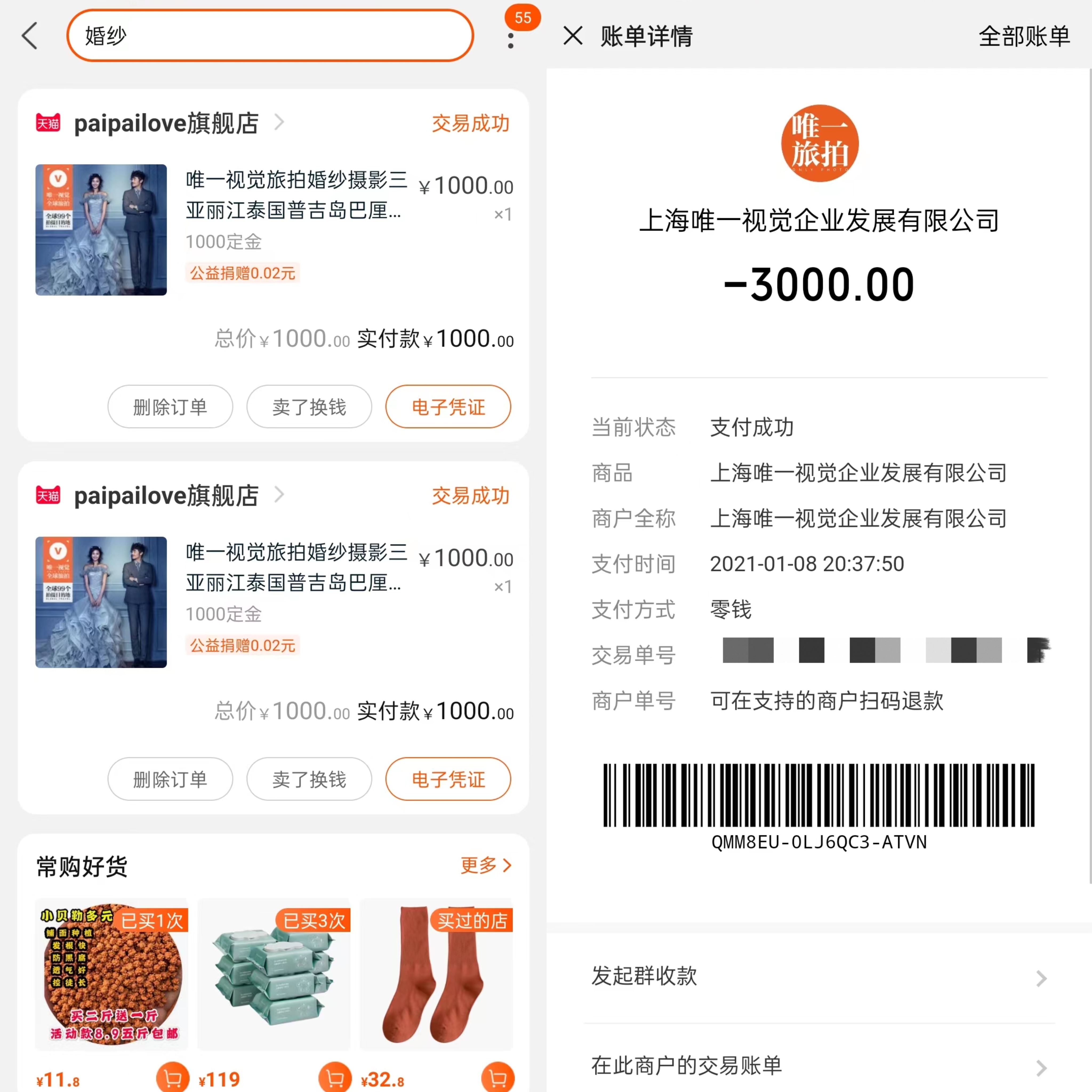周女士介绍,2017年,她在淘宝搜索婚纱照拍摄相关信息时,找到了“唯一视觉”店铺。之后,她支付2000元定金订购了国外旅拍婚纱照服务,选址普吉岛,五年内有效。