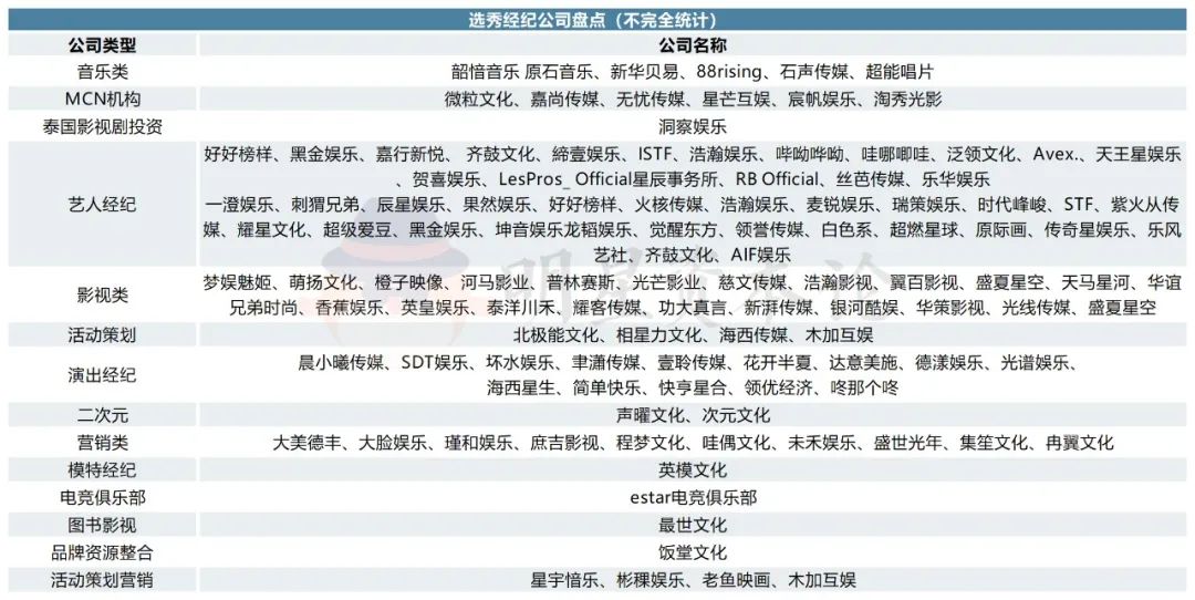 在偶像经济风头最盛的那几年,图书影视公司最世文化、电竞俱乐部estarpro、MCN机构宸帆娱乐、淘秀光影以及娱乐营销公司冉翼文化、盛世光年也都曾加入到选秀混战的行列中。当秀综被叫停后,这些公司选择回归自己的主营业务。