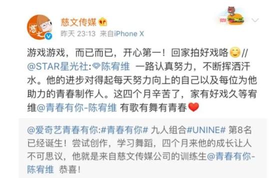 慈文传媒在这方面看得更透彻,虽然这家公司对于参加秀综的态度很积极,但对出道与否并无执念。《青你1》成团夜,旗下艺人陈宥维成功出道,慈文传媒就发了这样一条祝贺微博,“游戏而已,开心第一,回家拍戏”。可见,对慈文而言,旗下艺人最终归宿还是拍戏。