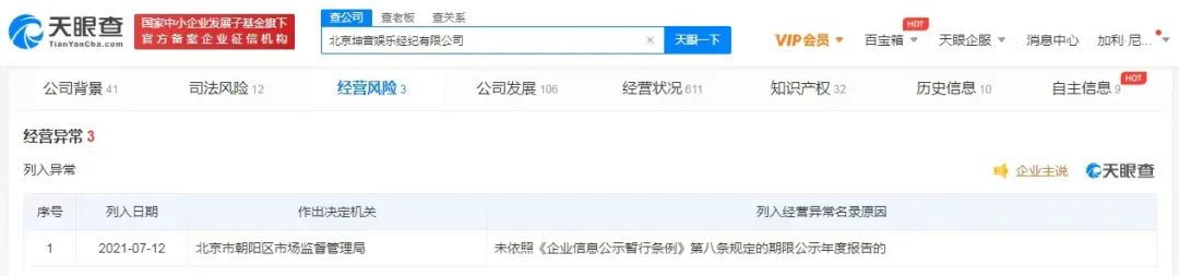 伴随着头部偶像的解约,坤音的曝光率大幅下滑,2021年坤音娱乐关联公司北京坤音娱乐经纪有限公司还因未依照《企业信息公示暂行条例》第八条规定的期限公示年度报告,被北京市朝阳区市场监督管理局列入经营异常。