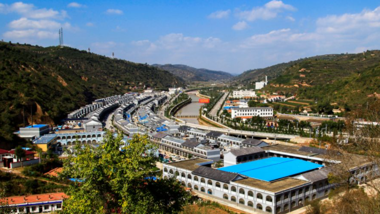这里两山夹一川,清秀却不清闲,漫步在整洁宽敞村道上,片片红叶在阳光的照耀下色泽透亮,与青白瓦墙的易地扶贫搬迁住宅小区、正在修建的古寺一条街相应成景。