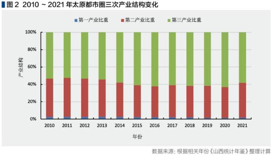 (二)产业结构不断优化,第三产业比重不断上升2010~2020年,太原都市圈三次产业结构由2.7∶44.0∶53.3调整为1.6∶35.2∶63.2,第三产业比重不断增加,第二产业和第一产业均呈现下降趋势,表明产业结构不断优化;但在2021年太原都市圈三次产业结构转变为1.7∶40.1∶58.2,第二产业结构反转态势明显(图2)。这是因为2021年第二产业增长过快所致,2021年第二产业增加值增长了17.6%、第三产业增加值仅增长了12.8%。近年来,在新能源汽车、装备制造等产业带动下,太原都市圈经济新动能加快成长,战略性新兴产业、高技术产业快速发展,转型步伐强劲有力。