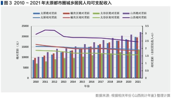 (三)城乡居民收入绝对差距不断扩大,相对差距逐渐缩小2010~2021年,太原、榆次区、太谷区的城镇居民人均可支配收入和农村居民人均可支配收入均稳步提升,且高于山西省平均水平。太原、榆次区、太谷区城乡居民收入差距进入了第二个阶段,即城乡居民收入绝对差距不断扩大、相对差距不断缩小阶段。2010~2021年,太原、榆次区、太谷区城乡居民人均可支配收入绝对差距不断扩大,但绝对差距均低于山西省平均水平;太原、榆次区、太谷区城乡居民人均可支配收入相对差距不断缩小,太原由2.1∶1(农村居民=1,下文同)下降到1.9∶1,榆次区由2.3∶1下降到1.8∶1,太谷区由1.9∶1下降到1.6∶1,均小于山西省平均水平(图3)。