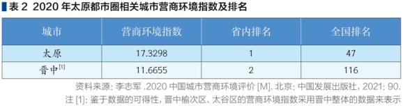 城市是企业生产经营的主要活动场所,其营商环境的优劣直接影响市场主体的活力和企业家投资区位的选择。2015年我国各级政府持续推动“放管服”改革以来,营商环境得到持续优化。2020年太原市在山西省内营商环境排名第1位,位列全国除直辖市外27个省会城市的第20位,位于全部参评城市(289个)的第47位,而晋中位列全部参评城市的第116位(表2)(李志军,2021)。总体而言,位于中部地区的太原都市圈,因市场化水平较低、法治环境较差、产业配套能力较弱、生产成本以及交易费用较高等诸多因素,营商环境整体水平不高。