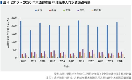 (四)环境问题较为突出,资源较为紧缺太原是山西省空气污染仅次于临汾的城市,2021年,太原空气质量优良天数为224天,低于山西省平均水平(山西省生态环境厅,2022)。此外,水资源严重短缺,2010~2020年,太原都市圈人均水资源占有量远远低于全国平均水平、略低于山西省平均水平,核心城市太原缺水尤为严重;2020年太原都市圈人均水资源占有量为234.97m3,是山西省人均水资源占有量的71.23%,全国人均水资源占有量的10.49%(图4)。由此可见,太原都市圈环境问题较为突出,发展资源较为紧缺,综合承载力有待提高。