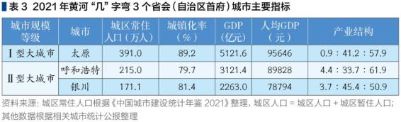 参考胡正塬(2013)的研究,黄河“几”字弯区域范围为“3+12”③个城市。发挥核心城市辐射带动作用,有助于推动黄河“几”字弯区域高质量发展,但“几”字弯区域的核心城市带动能力普遍较差(安树伟,张双悦,2021)。2021年,黄河“几”字弯区域Ⅰ型大城市仅有太原,太原都市圈是黄河“几”字弯区域唯一基本成型的都市圈;而省会(自治区首府)城市呼和浩特和银川的建成区常住人口分别为215.0万人、171.1万人,均为Ⅱ型大城市,有待进一步培育。此外,在常住人口城镇化率、地区生产总值、人均地区生产总值方面,太原均排名第一;太原第三产业占比为57.9%,略低于呼和浩特。总体来看,太原在黄河“几”字弯区域具有一定的优势(表3)。随着太忻一体化经济区的深入推进,太原都市圈优势将会进一步凸显。由此可见,太原都市圈是黄河“几”字弯区域实现高质量发展的重要引擎。