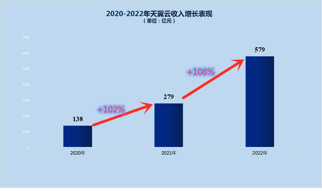 财报数据显示,2022年中国电信实现天翼云收入579亿元,同比增长108%,在2021年102%增速的基础上继续“加速”。其中,天翼云在公有云IaaS+PaaS领域的收入同比增长达132%。