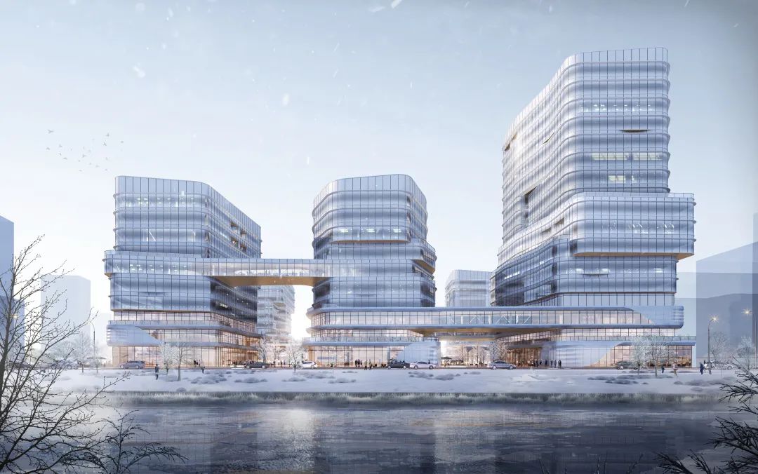 项目以层叠溪石为理念,通过流线动感的形态处理呼应滨水区位,通过层叠错动的建筑手法,形成面向湖面的景观平台,用空中连廊在不同标高对建筑进行联系,增加公共空间,形成互联共享的孵化办公平台。通过其流畅水平舒展造型的塑造,结合我区文化与新时代高效的互联网思维,表达了园区内部空间的自由与流动,使园区内充满科技感和未来感,传递着以科技进步为依托的精神,成为云时代的一个新里程碑。