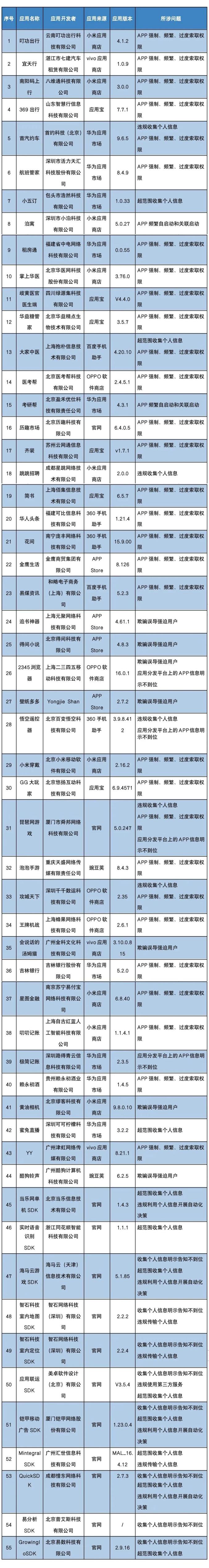 工业和信息化部通报存在问题的APP(SDK)名单