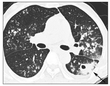 其中,胸部X线(或CT)在诊断PTB具有重要的临床价值。据循证依据,PTB患者感染灶好发于肺上叶尖后段、下叶背段及后基底段,其胸部X线(或CT)可见浸润、干酪样纤维钙化灶或空洞。典型的PTB病例如图1[8]所示。