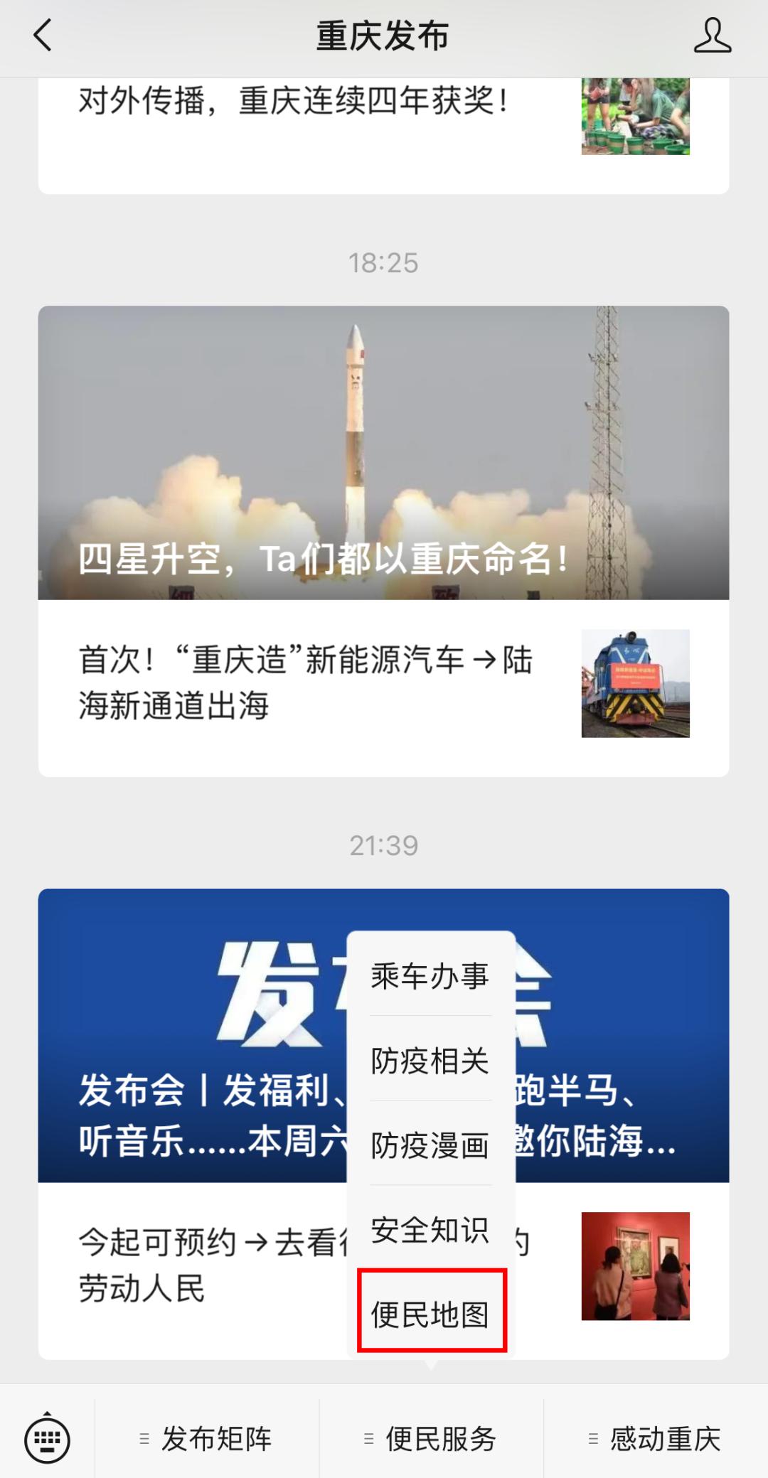 1、进入“重庆发布”微信公众号,点击底部菜单栏中的“便民服务”按钮。