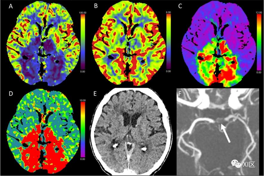 图3 脑部CTP生成的彩色编码图:(A)脑血流量(CBF)[mL/100 g/min],(B)脑血容量(CBV)[mL/100 g],(C)Tmax [s],以及(D)平均通过时间(MTT)[s]。(E)NECT和(F)动脉CT血管成像(CTA)最大密度投影(MIP)图像。该患者在经导管主动脉瓣植入术(TAVI)后出现异物感并昏迷。在NECT图像上,没有发现脑实质的缺血性改变。CTP发现CBF强烈降低,CBV正常,导致Tmax和MTT强烈延长,这与急性缺血事件相一致,表明有一个大的半影,没有环形的缺血核心。CTA显示基底动脉顶端有血栓性闭塞。