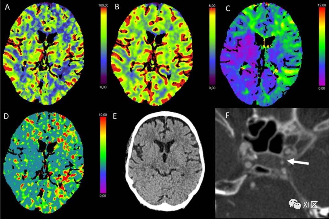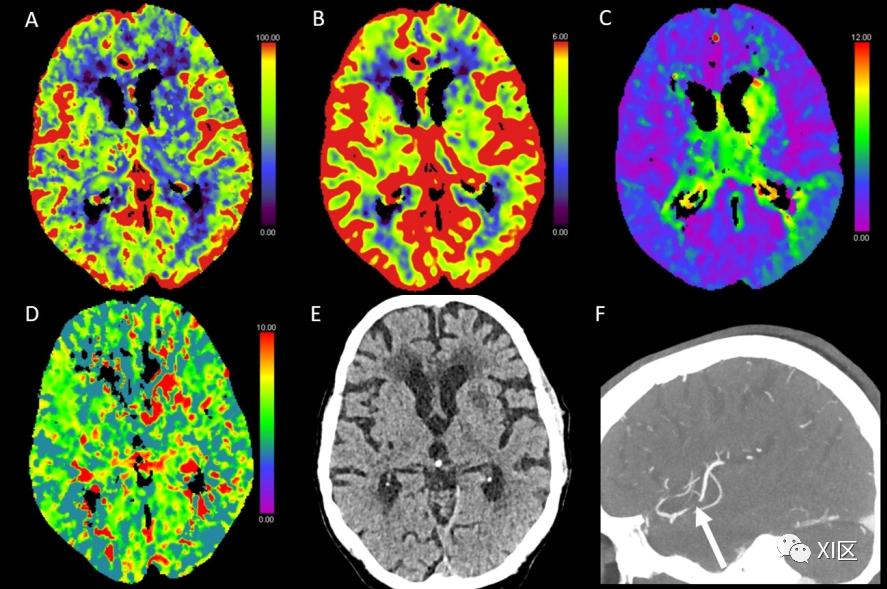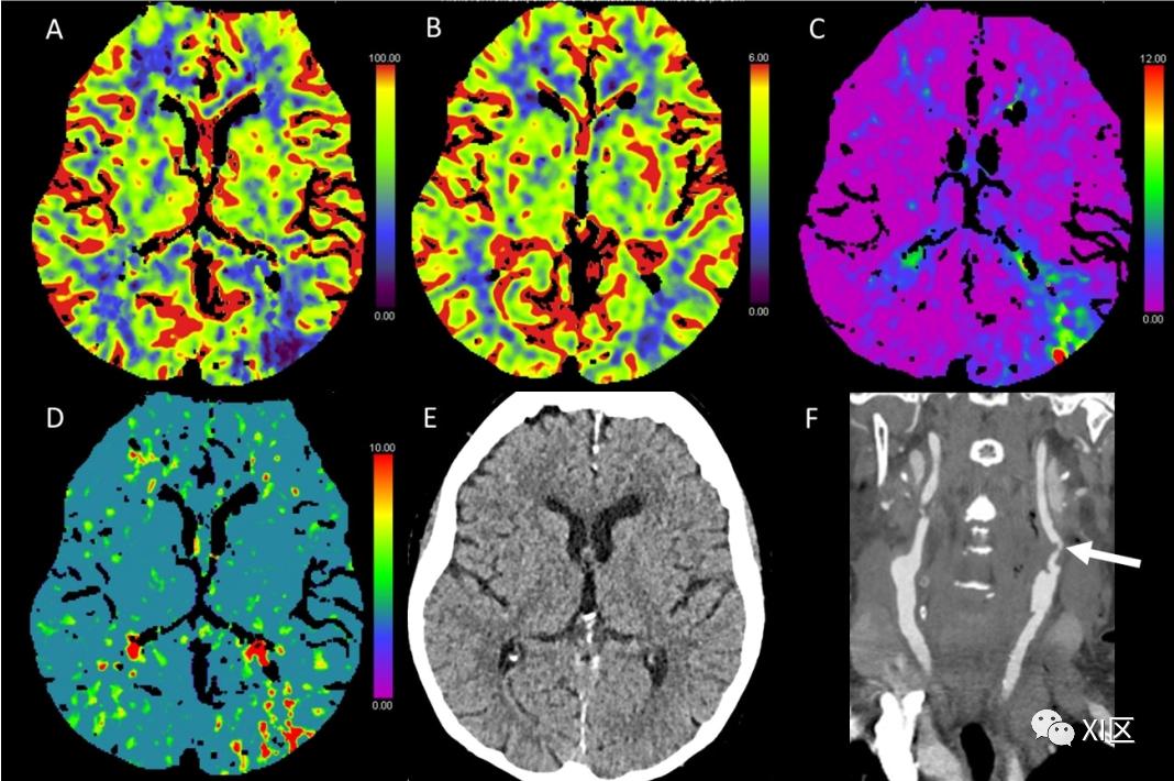 图2 脑部CTP生成的彩色编码图:(A)脑血流量(CBF)[mL/100 g/min],(B)脑血容量(CBV)[mL/100 g],(C)Tmax [s],以及(D)平均通过时间(MTT)[s]。(E)NECT和(F)动脉CT血管成像(CTA)。该患者在经导管主动脉瓣植入术(TAVI)后出现了左侧的暗区。在NECT图像上,只有大脑皮层有轻微的低密度改变,右枕部皮层有轻微的脑肿胀。CTP显示该区域的CBF和CBV降低,Tmax和MTT延长。CTA图像上没有发现明显的血管闭塞。