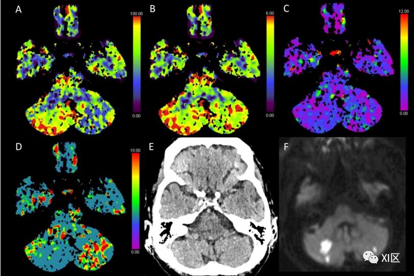 图6 脑部CTP产生的彩色编码图:(A)脑血流量(CBF)[mL/100 g/min],(B)脑血容量(CBV)[mL/100 g],(C)Tmax [s],以及(D)平均通过时间(MTT)[s]。(E)NECT和(F)扩散加权磁共振成像(MRI)在第二天进行。该患者在经导管主动脉瓣植入术(TAVI)后出现了手臂肌阵挛(尤其是左侧)、嗜睡和高血压。在NECT图像上,看不到明显的分界线或脑部肿胀。在CTP图上,左小脑半球的CBF降低,CBV正常,Tmax正常至轻微延长,MTT明显延长,表明后颅窝内有急性梗塞。然而,CTA上没有发现血管闭塞。与CTP的发现相反,第二天进行的MRI扫描显示左侧小脑半球有小的弥散限制,右侧有较大的弥散限制,表明双侧半球急性缺血性损伤。
