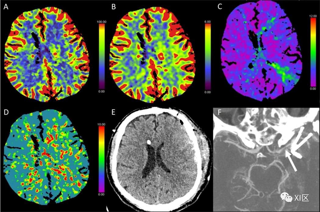 图1 脑部CTP产生的彩色编码图:(A)脑血流量量(CBF)[mL/100 g/min],(B)脑血容量(CBV)[mL/100 g],(C)Tmax [s],以及(D)平均通过时间(MTT)[s]。(E)CT平扫(NECT)和(F)动脉CT血管成像(CTA)。该患者接受了心导管检查,以关闭房间隔缺损。之后,该患者出现了左侧偏瘫。NECT显示灰白质分化略有减少。在右侧的大脑中动脉(MCA)区域,CBF和CBV降低,Tmax和MTT延长。CTA显示右侧颈内动脉远端闭塞。