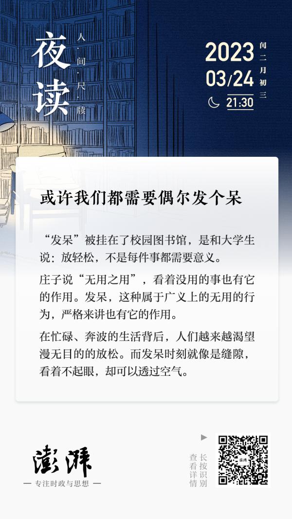 但当“发呆”被挂在了校园的图书馆里,相当于是和大学生说:放轻松,不是每件事都需要意义。一本正经地写上“发呆”这两个字,也是一本正经地认可了发呆的权利。