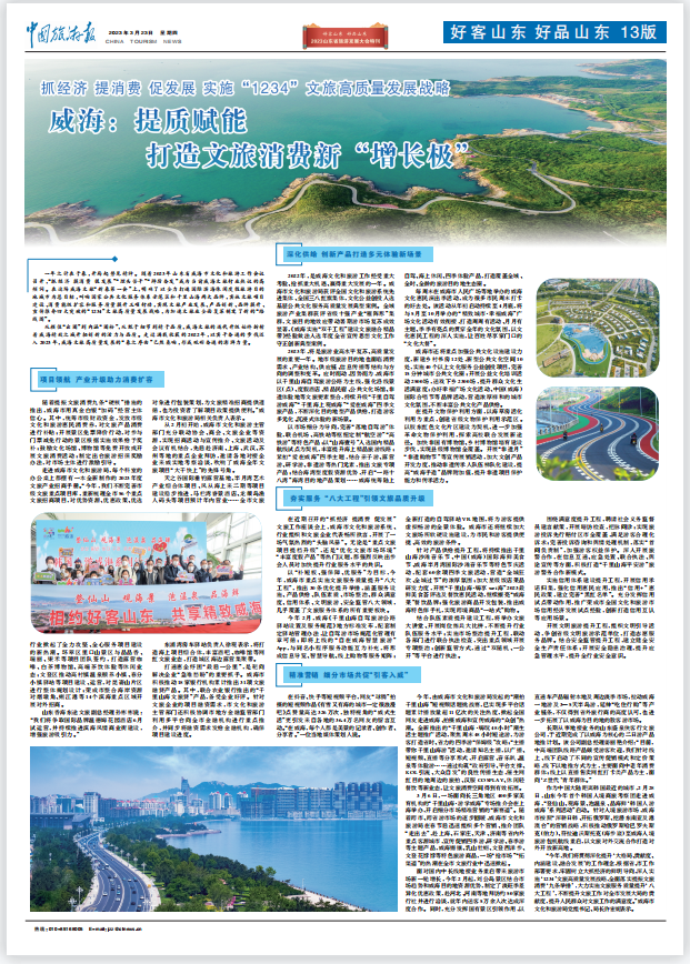 3月26日-27日,2023山东省旅游发展大会将在青岛举行。3月23日,《中国旅游报》推出“好客山东 好品山东——2023山东省旅游发展大会特刊”,关注山东各地文化旅游高质量发展。特刊重点推出《威海:提质赋能 打造文旅消费新“增长极”》整版报道,聚焦威海文旅高质量发展新征程。