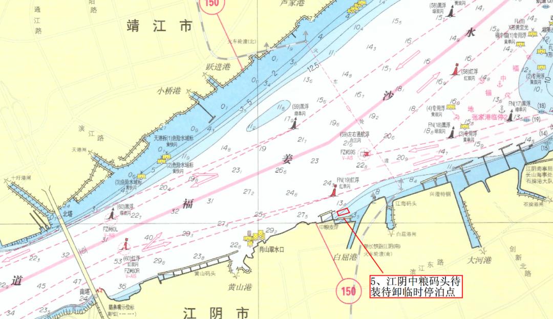 8.江阴利港电厂码头待装待卸临时停泊点概位:江阴利港电厂一期煤码头内档、利港电厂干灰码头前沿水域,长150米,宽100米水域范围内