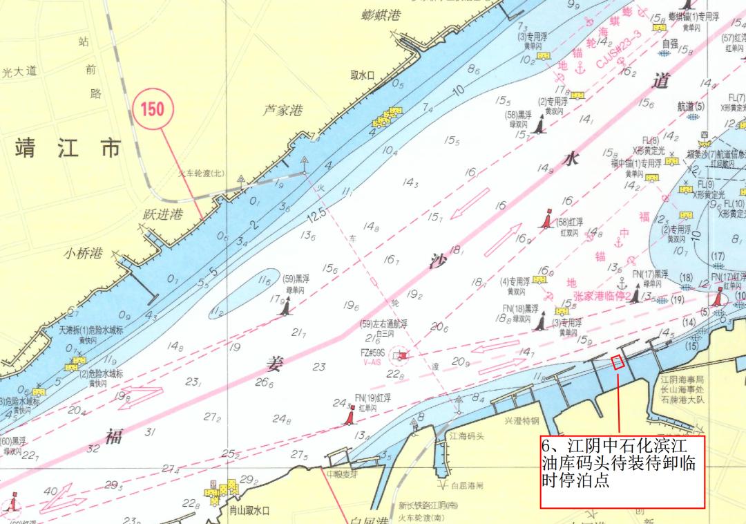 6.江阴中石化滨江油库码头待装待卸临时停泊点概位:江阴中石化滨江油库码头内港池水域,长80米,宽40米水域范围内
