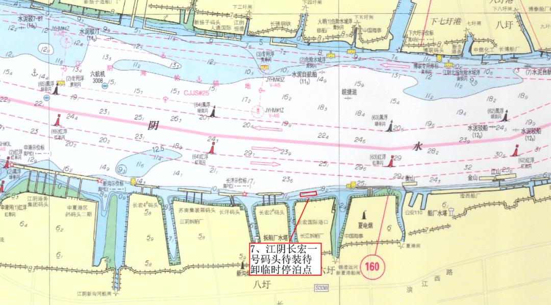 7.江阴长宏一号码头待装待卸临时停泊点概位:江阴新夏港河口上游,长宏一号码头下游水域,长150米,宽100米水域范围内