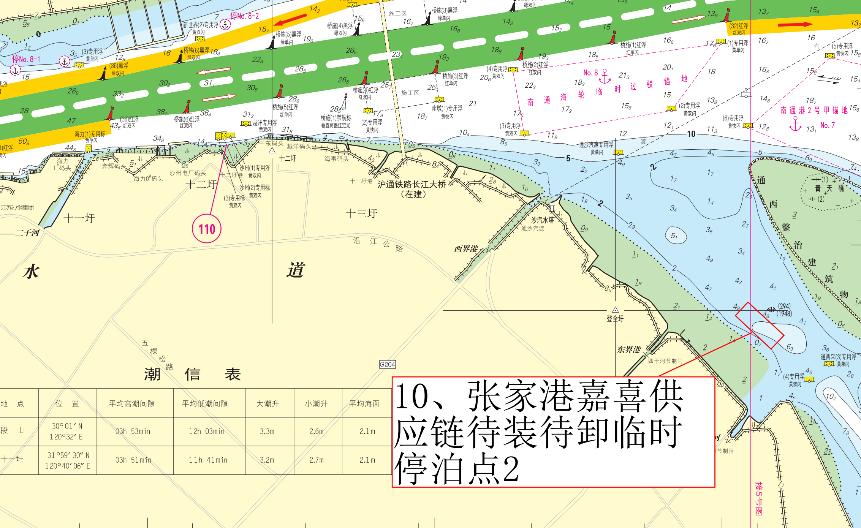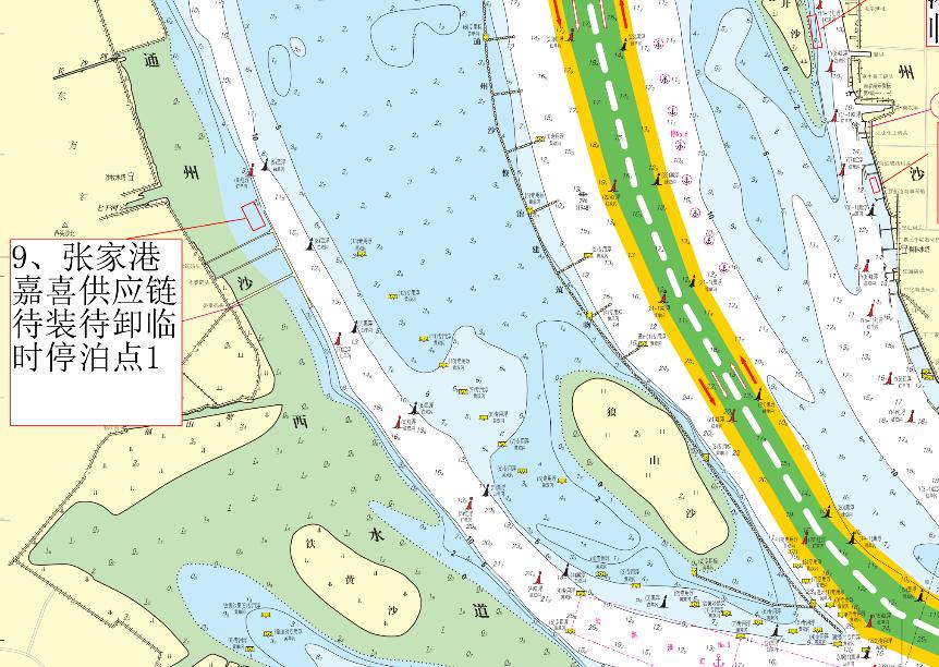 10.张家港嘉喜供应链待装待卸临时停泊点2概位:四干河至五干河间通州沙西水道左侧,长300米,宽100米水域范围内