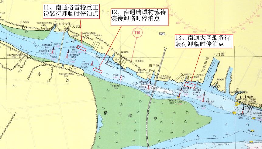11.南通格雷特重工待装待卸临时停泊点概位:南通天生港水道格雷特码头与象屿海装船台之间航道北侧水域,长500米,宽150米水域范围内