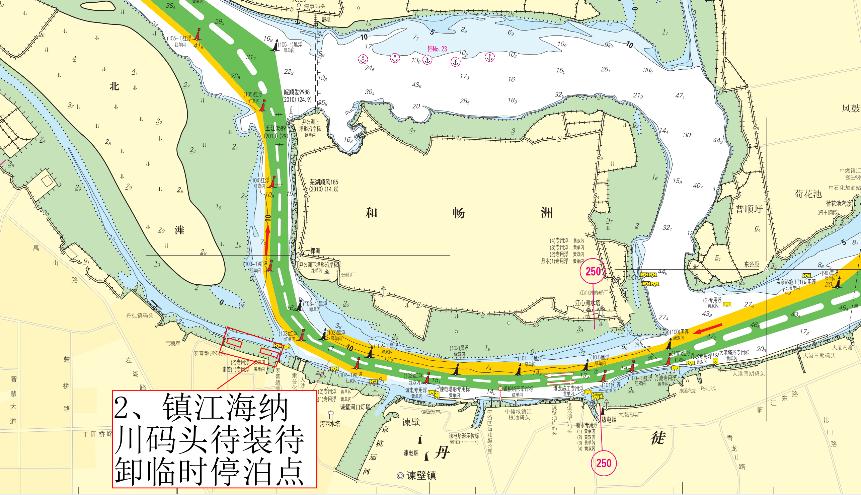 2.镇江海纳川码头待装待卸临时停泊点概位:(1)焦南水道下口南侧,海纳川散货码头向下游,长240米,宽130米水域范围内