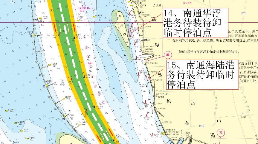 14.南通华浮港务待装待卸临时停泊点概位:南通营船港专用航道Y8#红浮至Y8-1#红浮连线外侧,长600米、宽200米的水域范围内