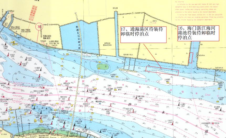 16.海门新江海河港池待装待卸临时停泊点概位:长江海门段新江海河港池西南侧600m岸线水域,长600米,宽75米水域范围内