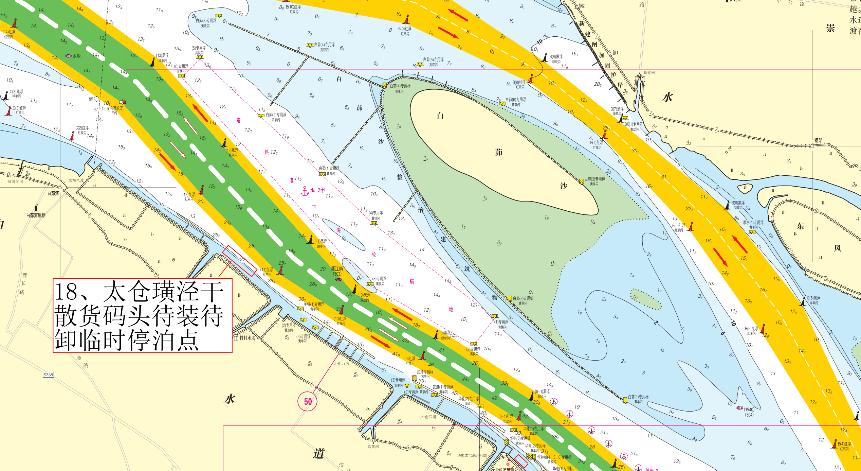 18.太仓璜泾干散货码头待装待卸临时停泊点概位:鑫海码头5#泊位上游,长约1200米,宽约180米水域范围内