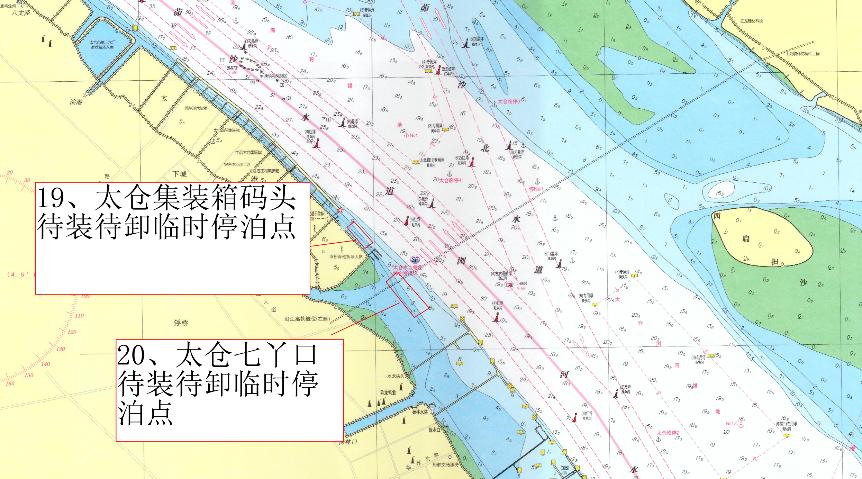19.太仓集装箱码头待装待卸临时停泊点概位:浮桥海事码头上游,长约500米,宽约200米水域范围内