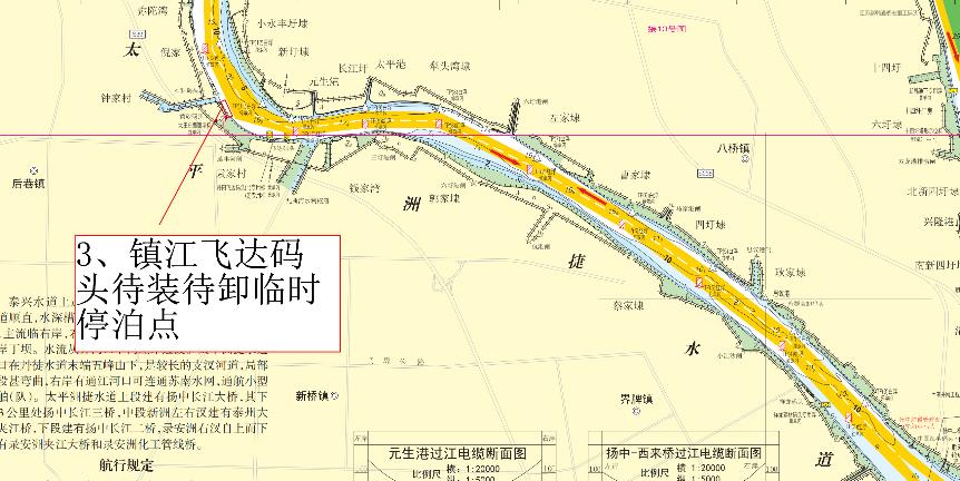3.镇江飞达码头待装待卸临时停泊点概位:太平洲捷水道TP#11浮南侧,太平河口下游下行通航分道外侧,长300米,宽100米水域范围内