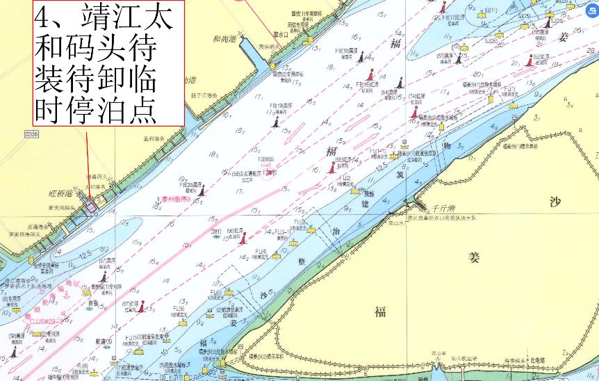 4.靖江太和码头待装待卸临时停泊点概位:FB#20-长江#57黑浮联线北侧,旺桥港节制闸外太和码头与新天地码头中间,长约100米,宽约100米水域范围内