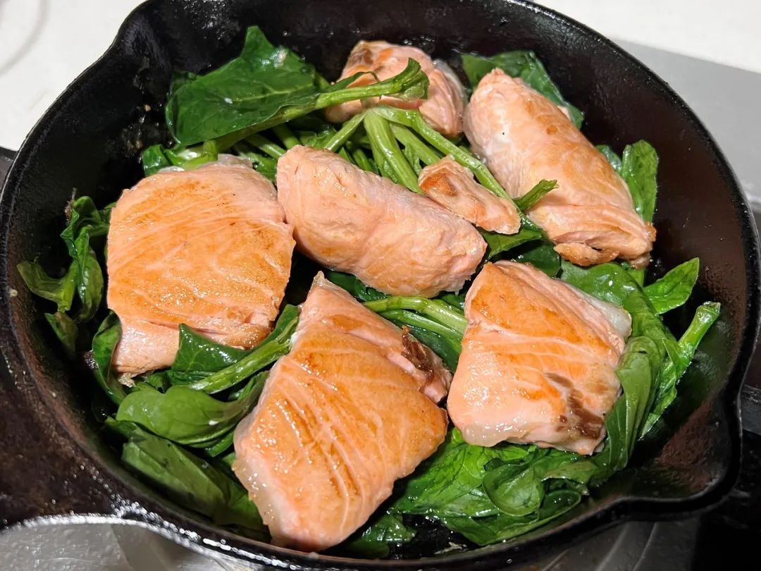 2.锅里放入洗净的菠菜,把煎香的三文鱼和对半切开的小番茄放在菠菜上面。