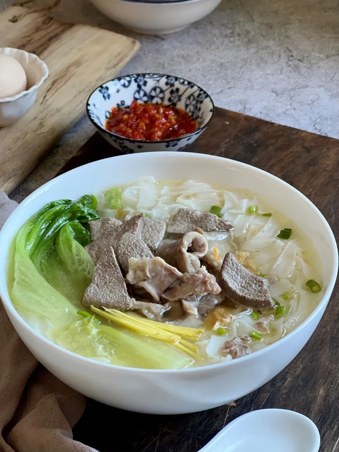 5.把煮好的猪杂和汤一起倒在碗中河粉上面,生菜叶夹放旁边,放炸蒜、小葱一起食用。