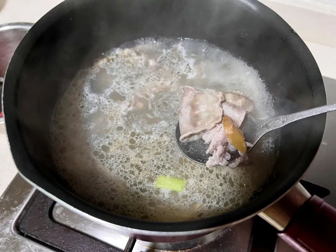 3.煮粉肠的汤和粉肠放入小锅,加盐、味精、姜丝,重新煮开,放入猪肝和里脊片煮1分钟。