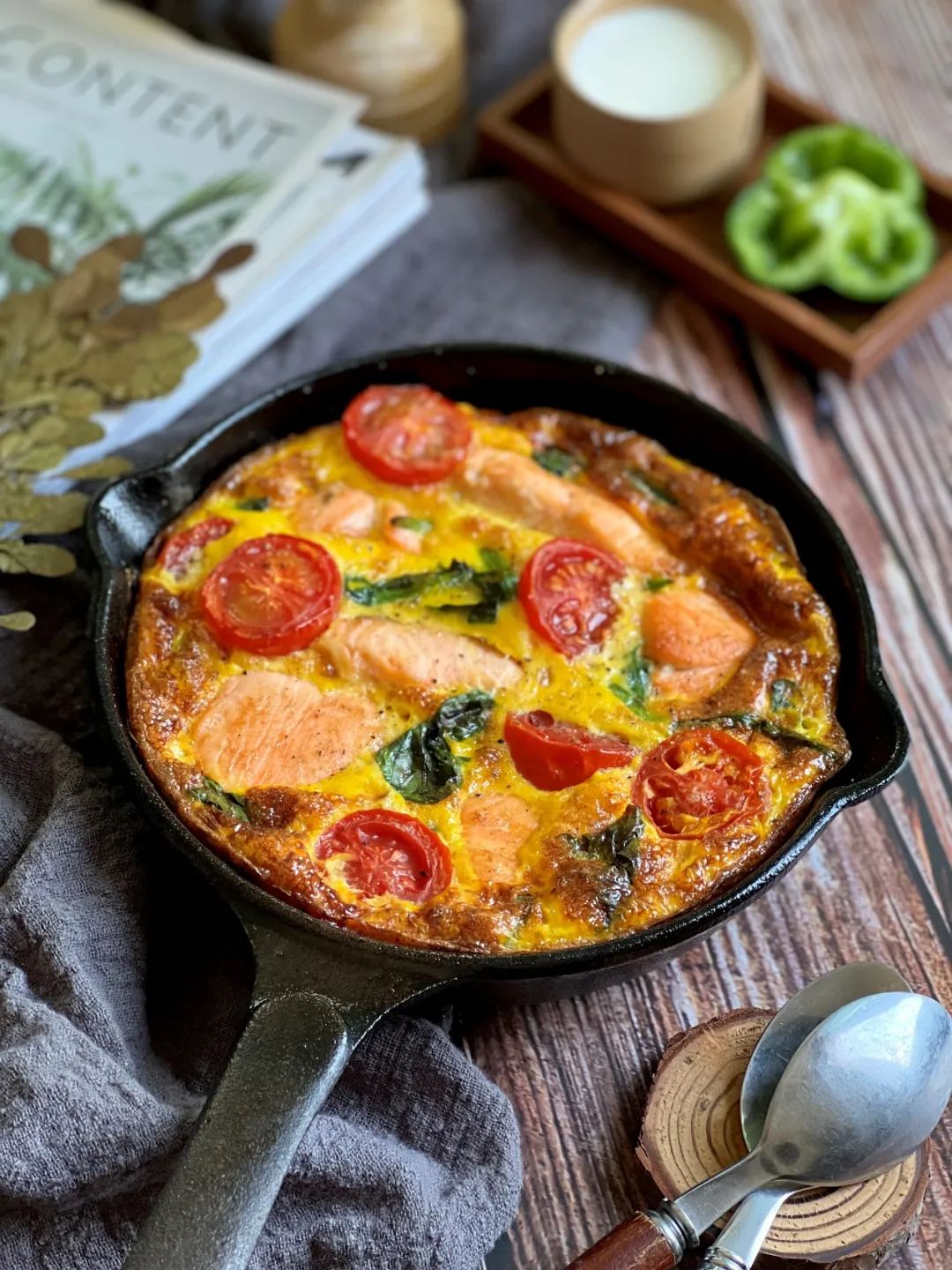 材料:三文鱼1大块,鸡蛋3个,菠菜10棵,小番茄6个,牛奶3大勺,橄榄油1大勺,盐1/2小勺,胡椒粉1/4小勺。