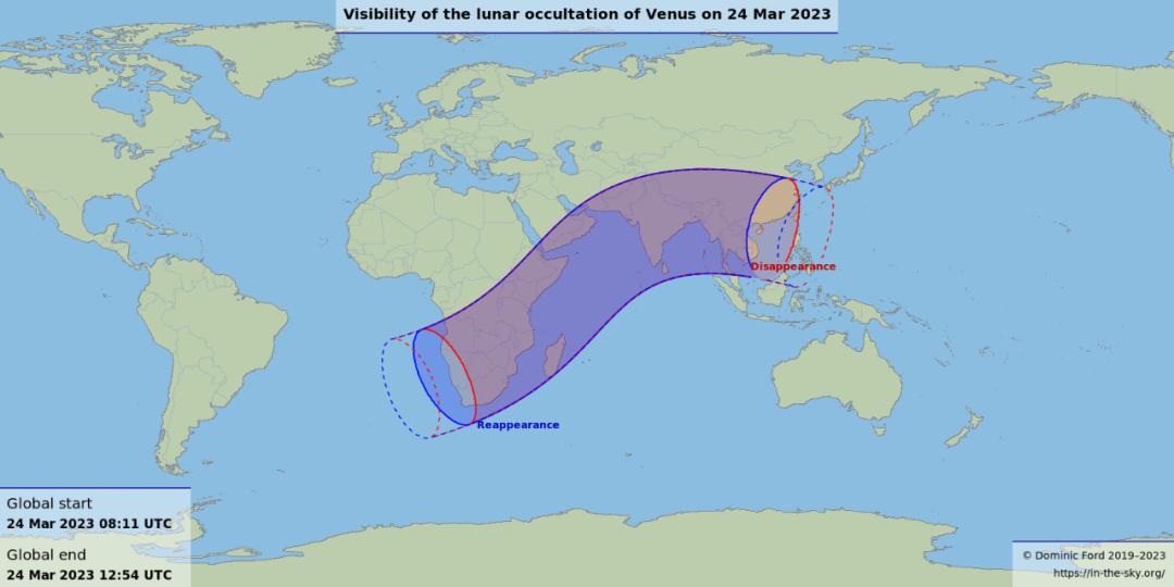 对于全球地区,月掩金星出现的频次更高(几乎每年都会发生一两次),上次也是在 2022 年 5 月 27 日;下一次则在 2023 年 11 月 9 日,亚洲西部、欧洲、北非等地可见。