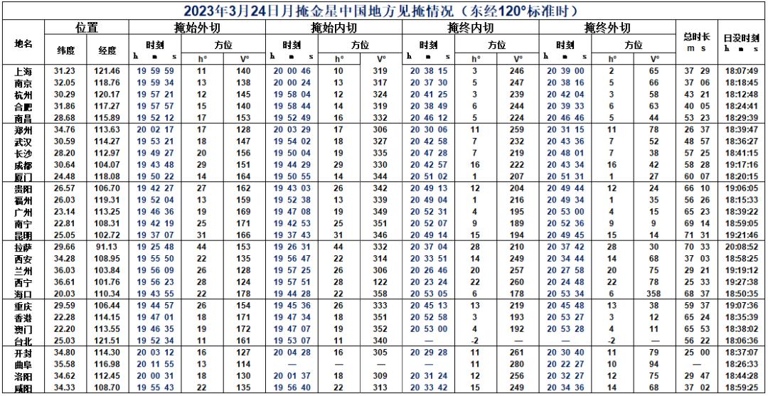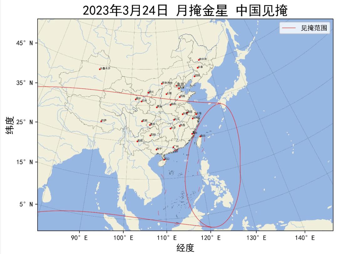 2023 年 3 月 24 日傍晚,一场美妙的星月童话将在中国天空上演。北京时间 18:27 金星合月,地心所见金星在月球以北 0.11 度的地方,在中国、印度、非洲等地可见月掩金星。