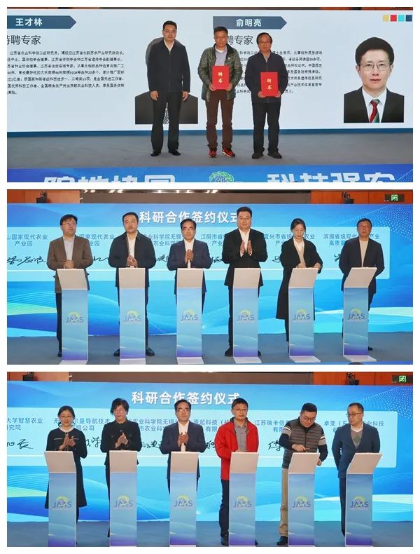启运仪式上,省农科院无锡分院与江阴市、宜兴市、锡山区、惠山区、滨湖区的省级以上农业产业园,与南京农业大学智慧农业研究院、无锡卡尔曼导航技术有限公司、原起科技(杭州)有限公司、江苏瑞丰信息技术股份有限公司、卓斐(东营)农业科技研究院有限公司分别签署科研合作协议;聘请省农科院二级研究员、水稻专家王才林和果树专家俞明亮为省农科院无锡分院特聘专家。启运仪式结束后,与会嘉宾还一同参观了省农科院无锡分院科研综合楼实验室、大数据中心等处,听取研究院发展规划和建设进展介绍。