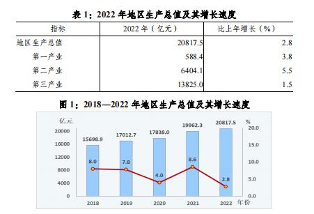 根据地区生产总值统一核算初步结果,全年实现地区生产总值(GDP)20817.5亿元,按可比价格计算,比上年增长2.8%。分产业看,第一产业增加值588.4亿元,增长3.8%;第二产业增加值6404.1亿元,增长5.5%;第三产业增加值13825.0亿元,增长1.5%。三次产业对经济增长的贡献率分别为4.9%、59.6%、35.5%。三次产业结构为2.8:30.8: 66.4。按常住人口计算,人均地区生产总值98149元,增长2.0%。