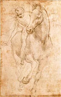 图2所示为达·芬奇为路德维科·斯福尔扎制作的数幅青铜骑马像设计草图中最著名的一幅,其最引人瞩目的应是马的动作,其双前蹄全部离地并高高抬起,马与人的重量完全落在马的后双腿上。骑在马背上的裸体人物,身体与头部有力地转向右侧,左腿略为弯曲,左脚踏在马镫之上,其动作充满了动感与张力。作者似乎没有最终确定马上骑士右手臂的位置,我们因此可以看到他绘出了右手臂的几个不同位置。也许是意识到了铸造双前蹄完全抬起的青铜骑马像的技术难度,达·芬奇在马身下方设计了一位已经倒地的敌人,他挣扎着用一只手臂举起盾牌挡住马匹可能将要落下的左前蹄,希望以此来加强支撑整个雕塑。