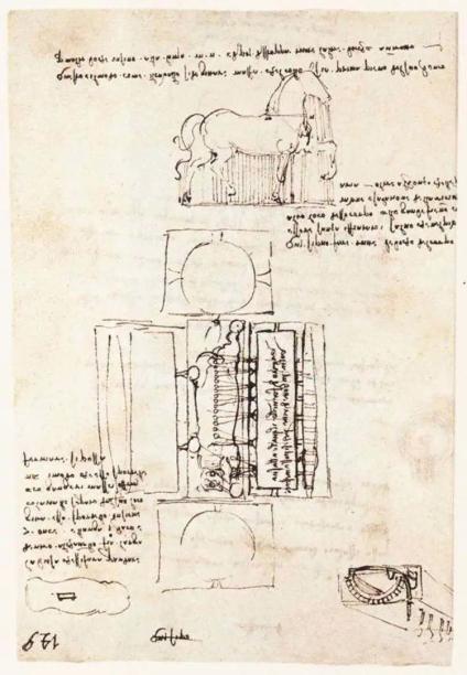图2中达·芬奇绘制的青铜骑马像是一个超越了他所处时代科技能力的设计,几年过后,也许由于工作进展缓慢,不仅路德维科·斯福尔扎开始怀疑达·芬奇是否真有能力完成这一野心勃勃的雕像,达·芬奇本人也逐渐意识到这一设计所面临的巨大困难。