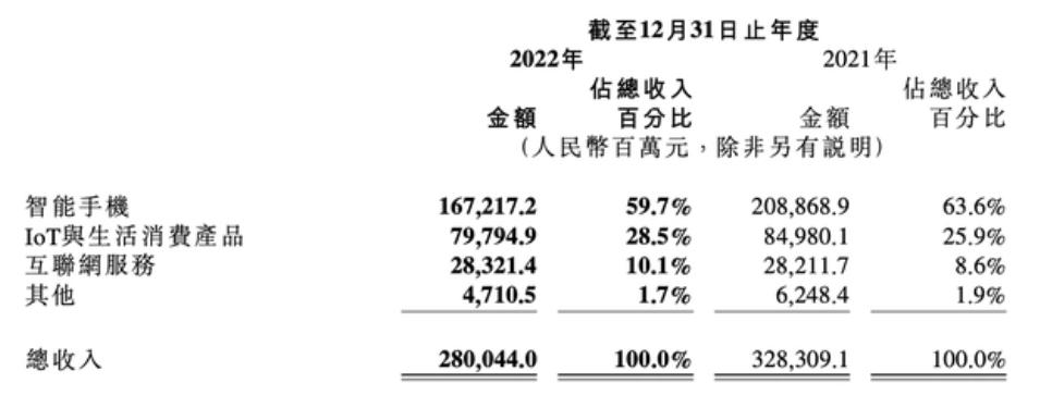 小米集团财报显示,2022年全年,在小米三大业务支柱中,智能手机业务营收同比下滑至19.9%至1672.17亿元;IoT与生活消费品业务营收同比下滑6.1%至797.9亿元;互联网服务业务营收同比增长0.4%至283.21亿元。