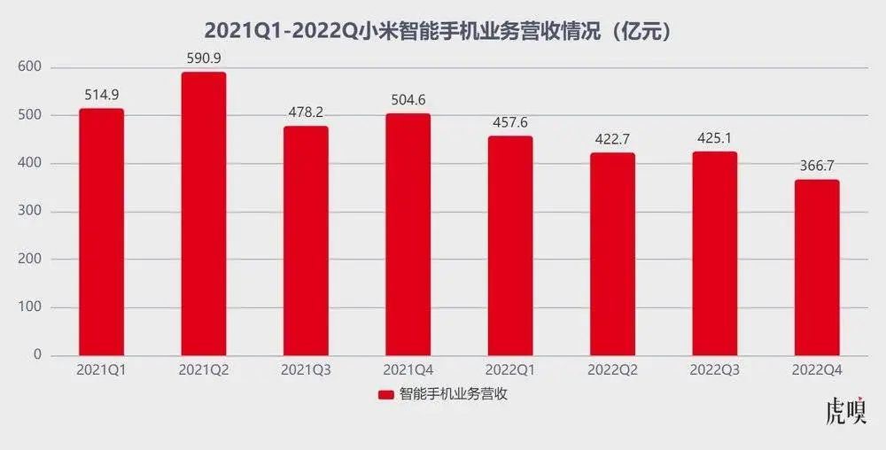 图片来源:小米如果细化到各个季度,智能手机业务的失速要更加明显。财报显示,2022年第四季度,小米智能手机业务同比下滑27.3%至366.72亿元。
