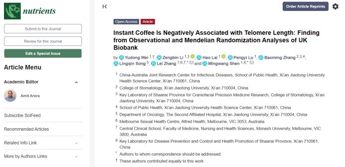 难以想象,咖啡的好处竟然有这么多,但是你知道吗?这些好处都是建立一个前提下,那就是,少喝速溶咖啡。这不,一项近期发表在Nutrients期刊上的研究就指出,常喝咖啡,特别是速溶咖啡,会缩短端粒长度,减少寿命。这篇论文名为“Instant Coffee Is Negatively Associated with Telomere Length: Finding from Observational and Mendelian Randomization Analyses of UK Biobank”,中文译作“速溶咖啡与端粒长度呈负相关:英国生物样本库的观察和孟德尔随机分析发现”。研究团队来自西安交通大学。