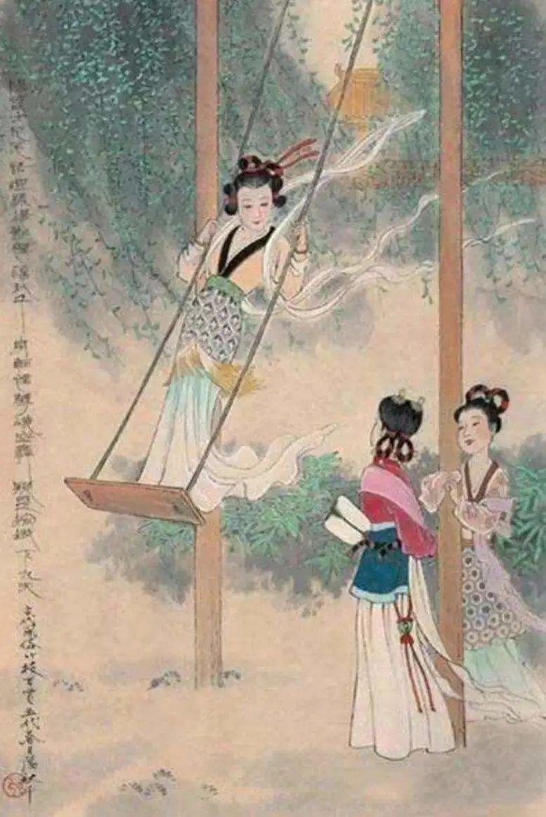 秋千之戏在南北朝时已经流行。《荆楚岁时记》记载:“春时悬长绳于高木,士女衣彩服坐于其上而推引之,名曰打秋千。”唐宋时期,荡秋千已经是很普遍的游戏,并且成为清明节习俗的重要内容。唐代诗人韦庄《麟州寒食》描写了清明荡秋千的习俗:“满街杨柳绿丝烟,画出清明二月天。好是隔帘花树动,女郎撩乱送秋千。”到了明代,荡秋千之风更甚,随处可见,竟然把清明节称为“秋千节”,可见荡秋千风俗之盛。明人刘若愚《酌中志•饮食好尚纪略》记载:“三月初四日,宫眷内臣换穿罗衣。清明则秋千节也。带杨枝于髩,坤宁宫后,及各宫皆安秋千一架。”明末清初的王崇简《清明》诗云:“尽说游行好,春深桃李天。香车旅曲水,宝马踏荒烟。风雨偏今日,莺花又一年,谁家归去晚,彩索尚秋千。”描写了清明踏青荡秋千的情景。