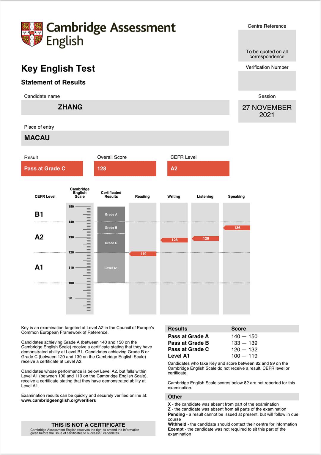 考前阳姐自己对口语不是很有信心,但最终口语反而最高分136。另外阅读也发挥得不好,比平时差得较多,写作倒是正常发挥,最终总分128分通过,没能拿到优秀,略有遗憾,但也算正常吧。