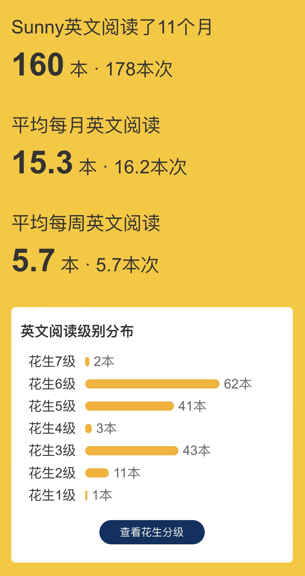 此阶段的读分为各种读,一套资源可以反复使用:裸听、听读、跟读、认读、默读,2020年合计阅读的本次为1772本次。这是娃2021年Star测试情况